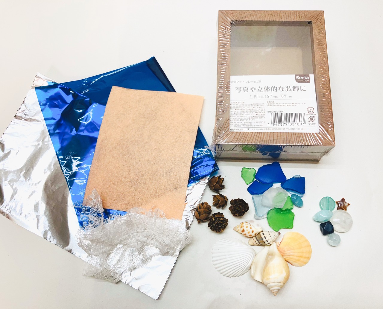 立体フレームに、シーグラスや貝がら、ビーズ、レース…